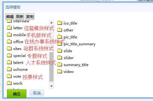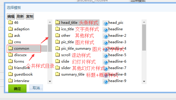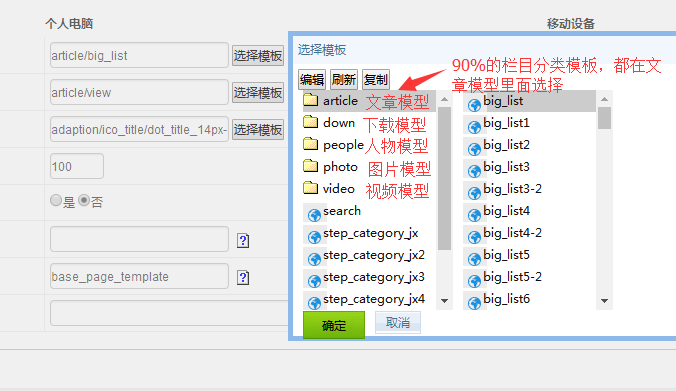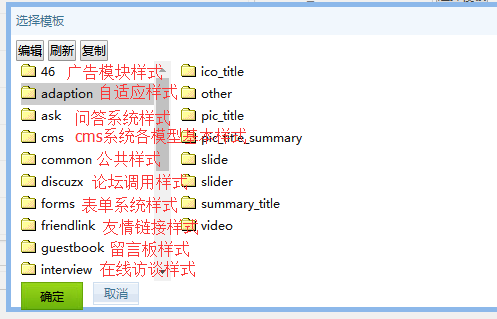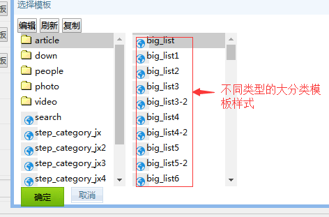 為了方便選擇,每個模板都提供樣式縮略圖;另外這些模板可以任意命名;下面是大分類模板。大分類一般以big_list開頭命名。