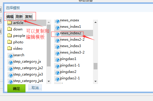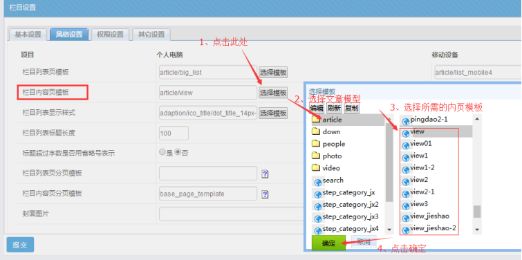 欄目的內頁模板選擇,點擊此處進行操作;內頁模板一般以view開頭命名。