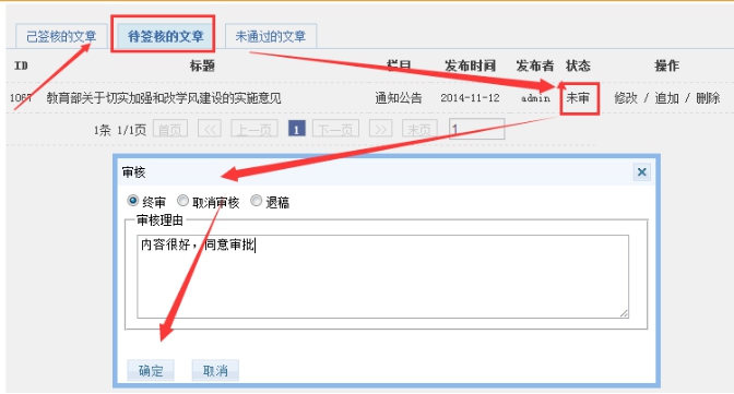 任何級別的管理員,可以審核自己所管理欄目的所有文章;權限可以細化到某個欄目;管理員權限通過后臺設置的。