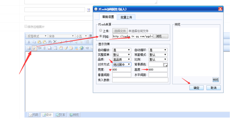 點擊swf按鈕------選擇網絡項----復制上面這個獲得騰訊地址--------設置視頻寬度和高度-----設置居中--------點擊確定