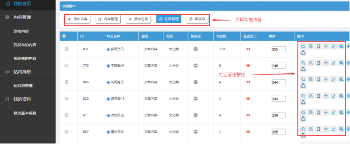 點(diǎn)擊批量操作----頂部有內(nèi)容管理、欄目管理、回收站等快捷按鈕-------右邊有欄目管理按鈕