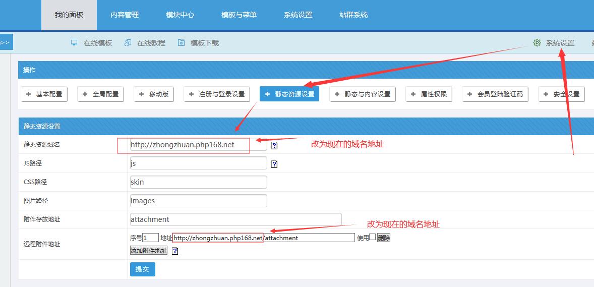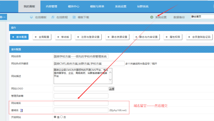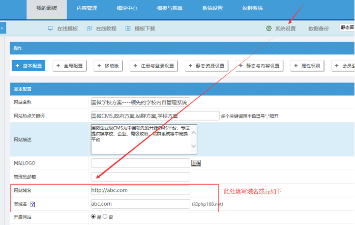 用舊網(wǎng)站后臺(tái)賬號密碼登陸后(或強(qiáng)制登陸后臺(tái)),此處就可以設(shè)置新的網(wǎng)站域名和基域名。