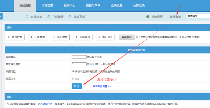 將現(xiàn)在最新的數(shù)據(jù)點(diǎn)擊備份下,便于新網(wǎng)站的數(shù)據(jù)還原