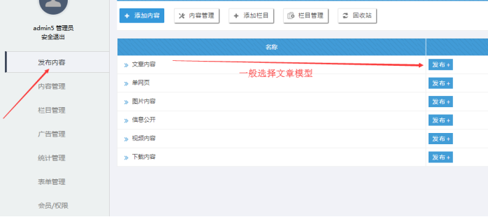 系統(tǒng)有多個模型,每個模型不同字段,用來存放不同要求的內(nèi)容;有文章模型、圖片模型、視頻模型、下載模型、信息公開模型;絕大部分我們用文章模型。