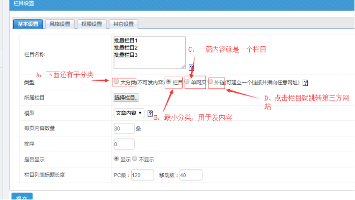最后點擊提交即可,欄目即可創(chuàng)建完成(其他的設(shè)置用默認即可,有需要可以再去修改)