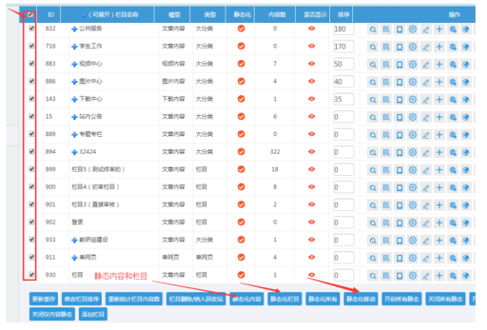 J:欄目和內(nèi)容靜態(tài)(勾選欄目,分別點擊靜態(tài)欄目和靜態(tài)內(nèi)容;前臺是靜態(tài)化屬于開啟狀態(tài);如果有內(nèi)容顯示不匹配,就考慮靜態(tài)化)