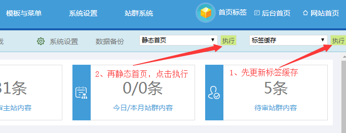 靜態(tài)首頁:如果我們想首頁(靜態(tài)的,不帶index.php動態(tài)尾綴的)想立刻看到新增內(nèi)容變化;可以立刻選擇“靜態(tài)首頁”(需先更新下標(biāo)簽緩存),點(diǎn)擊執(zhí)行按鈕即可。