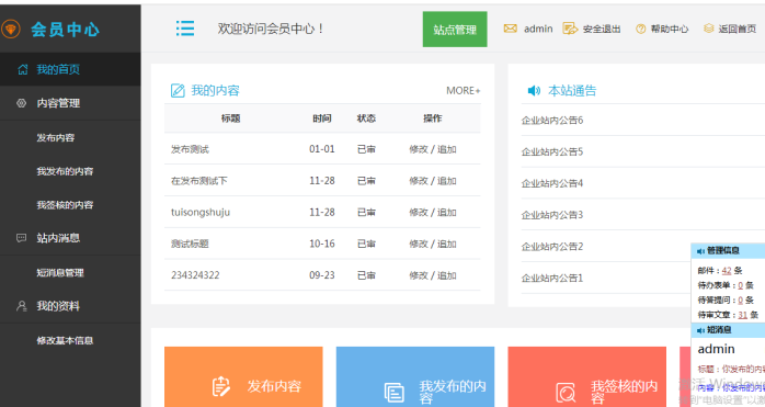 會員中心效果:會員中心功能包括投稿、內(nèi)容審核、數(shù)據(jù)刪除、更新首頁等功能;所有人的內(nèi)容操作基本都