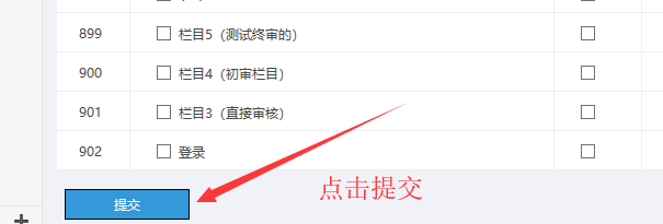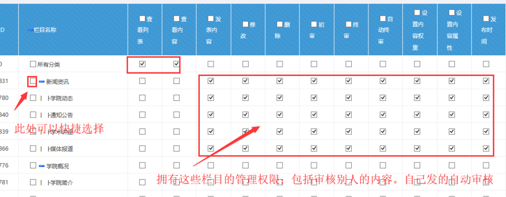 下圖可以勾選所有分類的按鈕。表示該角色對所有欄目,擁有欄目查看、內容查看的權限: