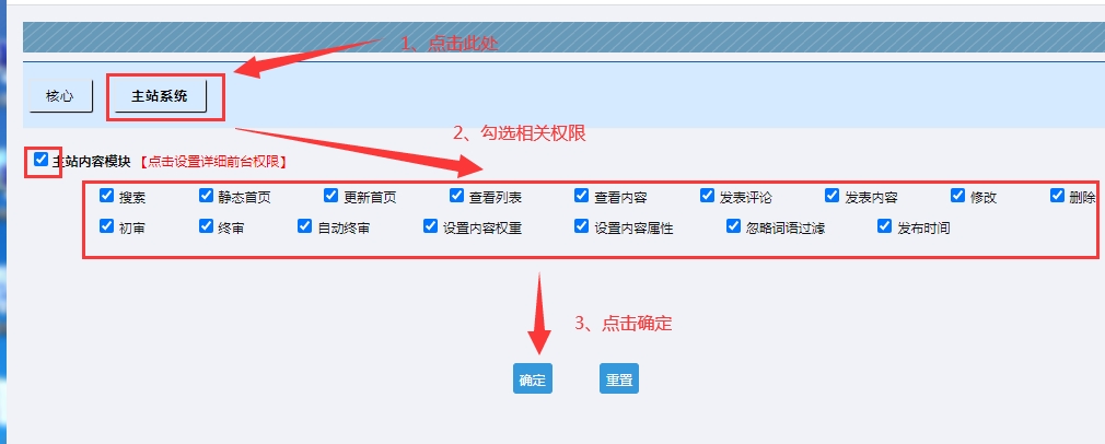 切換到【主站系統】-----如果是欄目管理員,可以勾選所有總開關---點擊確認即可(需要再對細分權限設置,才能