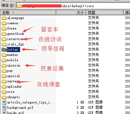 網(wǎng)絡(luò)問政主要有 領(lǐng)導(dǎo)信箱、民意征集、在線調(diào)查、在線訪談這幾個模塊組成,他們的模板都統(tǒng)一在公共模板default里面,具體位置如下