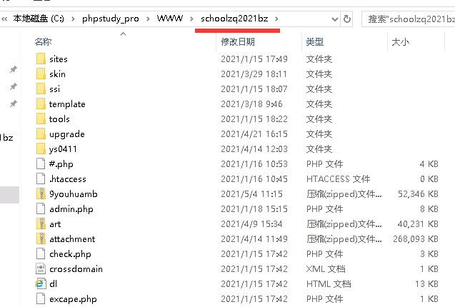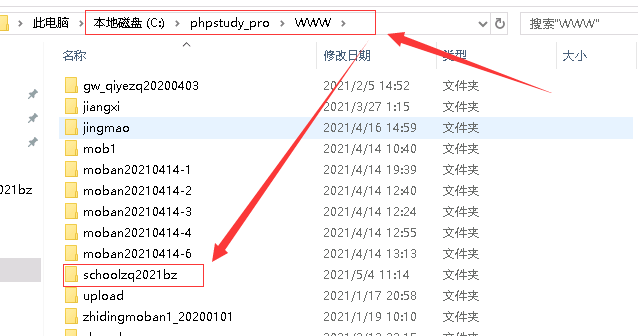 B:點(diǎn)擊進(jìn)入www目錄,這個(gè)目錄存放了所有安裝程序的目錄,現(xiàn)在選定我們需要的那個(gè)網(wǎng)站,假設(shè)是 schoolzq2021bz這個(gè)網(wǎng)站,里面存放的是程序