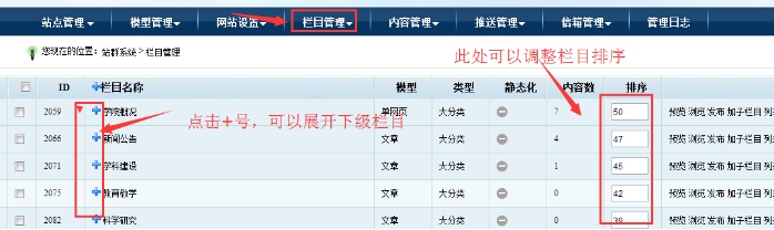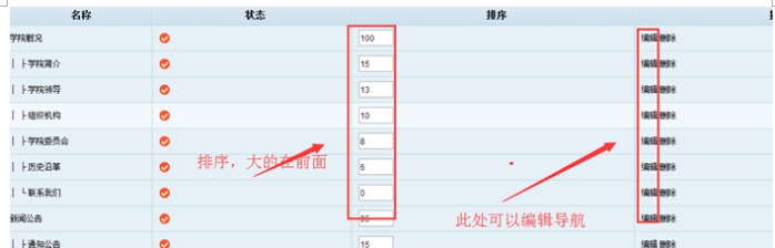 欄目排序:大的數字排在前面;數字大小是同級欄目比較。