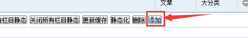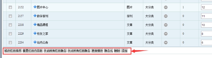 欄目操作:底部的欄目操作按鈕,包括排序、靜態、添加。