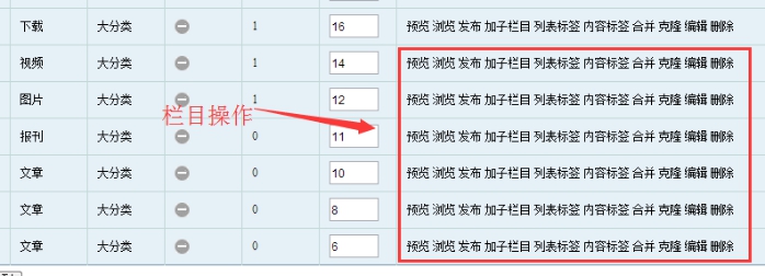 欄目常規操作:第一個預覽是優先靜態的;第二個預覽是肯定動態的;克隆:創建一模一樣的欄目出來;合并是將此欄目與哪個欄目合并。
