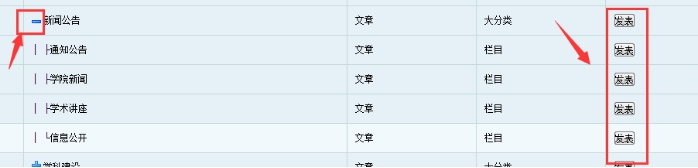 后臺發布:點擊添加內容后,可以展開左邊的+號,顯示小列表;然后點擊右邊的發布按鈕發布內容