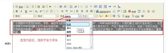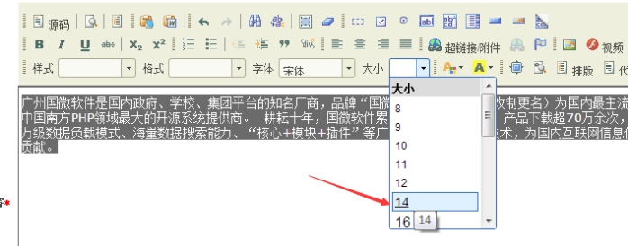 一般從word復制過來的內容,粘貼到網站上;需要全選內容后,重新選擇字體“宋體”、字體大小“14號”;這樣整體的word內容會格式工整。
