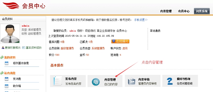 2、 進入會員中心后,點擊” 內容管理”;管理自己發布的內容