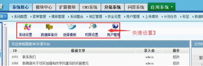 此處主要解決后臺常用設置的入口;(此處是新創建的網站的時候,做設置比較多)