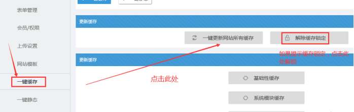 A:進入網站后臺-----點擊“一鍵緩存”-----點擊“一鍵更新網站所有緩存”
