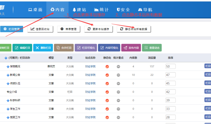 方法:在子網站后臺-----點擊【內容】按鈕-------點擊【欄目管理】-----點擊【重新統計內容數】:
