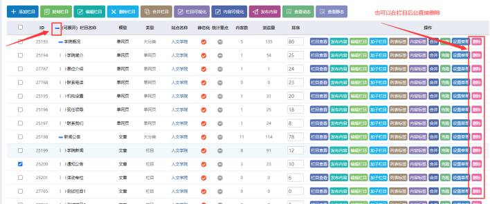 進(jìn)入欄目管理界面后,【展開(kāi)所有欄目】-----【勾選所需刪除的欄目】-------點(diǎn)擊【刪除欄目】
