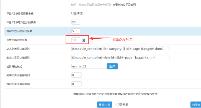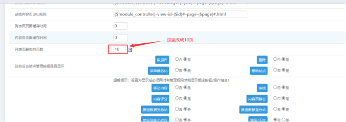 下面這個位置設置為:10 表示每次發布內容,本欄目列表自動靜態前面10頁的內容,最后點擊提交