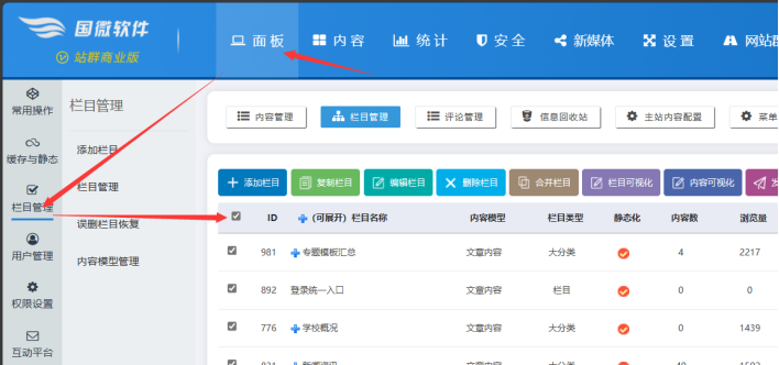 在主站后臺-----點擊【面板】----點擊【欄目管理】----勾選所有欄目按鈕: