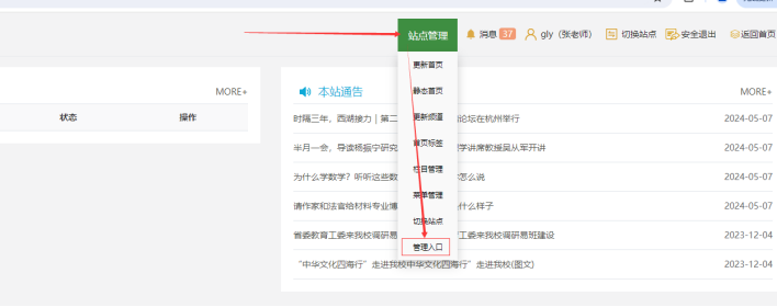 所有用戶登錄在此界面;點(diǎn)擊【主站會(huì)員中心登陸】----登陸后,鼠標(biāo)放在【站點(diǎn)管理】按鈕上----點(diǎn)擊【管理入口】。