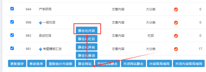 靜態(tài)化欄目操作:鼠標(biāo)放在【靜態(tài)網(wǎng)站】按鈕上----點(diǎn)擊【靜態(tài)化欄目】