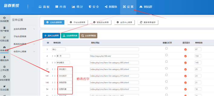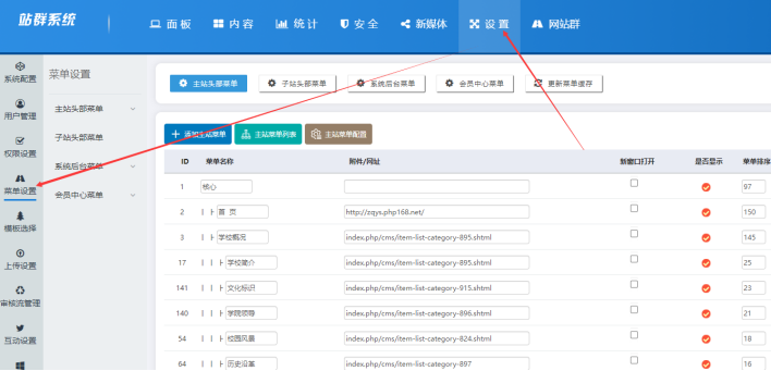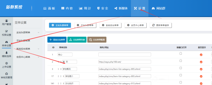 進(jìn)入主站后臺(tái)-------點(diǎn)擊【設(shè)置】-----點(diǎn)擊【菜單設(shè)置】,右邊就顯示我們的菜單管理界面: