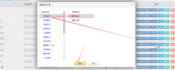 2)、開始選擇欄目: 在新增的空白欄目位置,點(diǎn)擊右邊的【欄目選擇】-------勾選對(duì)應(yīng)的目標(biāo)欄目(如果需要新增多個(gè)二級(jí)目錄,可以多選)-----點(diǎn)擊【確定】按鈕