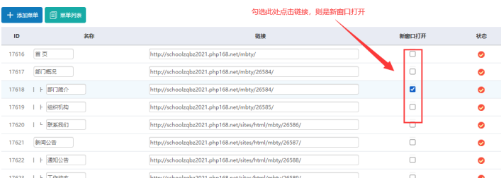如果一個(gè)菜單鏈接,我們點(diǎn)擊的時(shí)候想要【新窗口】打開,則點(diǎn)擊右邊的【勾選】即可----然后點(diǎn)擊【提交】即可。