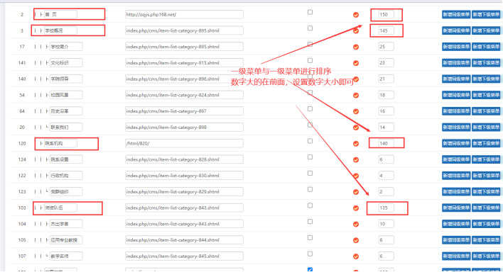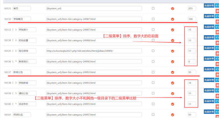 二級(jí)菜單的排序,只和當(dāng)前一級(jí)菜單欄目下的有效,比如【新聞公告】下的幾個(gè)二級(jí)菜單,他們之間相互比較數(shù)值即可,數(shù)字大的排在前面;和其他一級(jí)菜單下的排序無關(guān)。