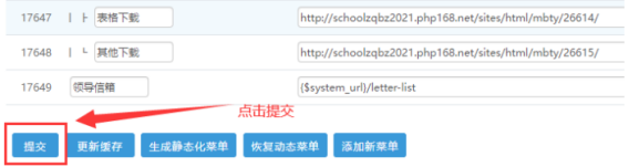 點(diǎn)擊提交后,如果需要查看效果,查看本文檔中【二】步驟。需要【更新菜單緩存】---【靜態(tài)主站所有內(nèi)容】----打開對(duì)應(yīng)網(wǎng)頁【快速刷新兩次瀏覽器】即可