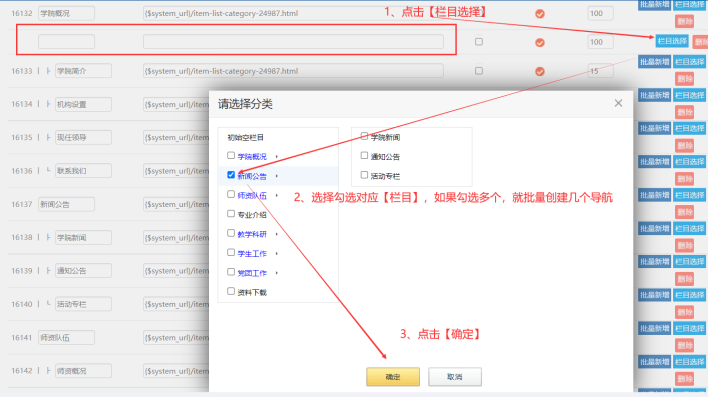 2)、開始選擇欄目: 在新增的空白欄目位置,點(diǎn)擊右邊的【欄目選擇】-------勾選對(duì)應(yīng)的目標(biāo)欄目(如果需要新增多個(gè)一級(jí)目錄,可以多選)-----點(diǎn)擊【確定】按鈕