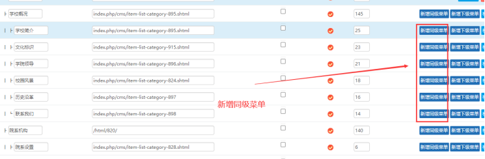 1)、快速添加法:在同是【二級(jí)菜單】菜單的后面,點(diǎn)擊【批量新增】按鈕;本操作是點(diǎn)擊了【校園風(fēng)景】后面新增同級(jí)菜單按鈕,表示增加一個(gè)和他平級(jí)的菜單。