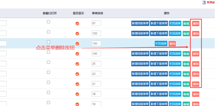 備注:刪除菜單的時(shí)候,有時(shí)候也需要?jiǎng)h除欄目,根據(jù)你的情況進(jìn)行處理。