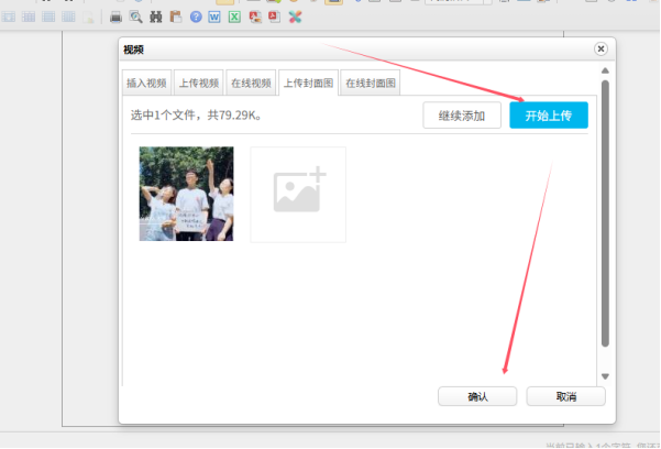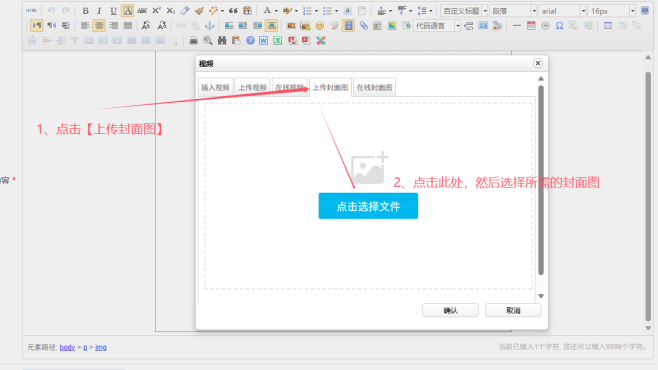 B、在彈出框中,點擊【上傳封面圖】------選擇事先準備好的視頻封面圖(可以在播放的視頻上,QQ截圖保存一個視頻播放界面到本地)